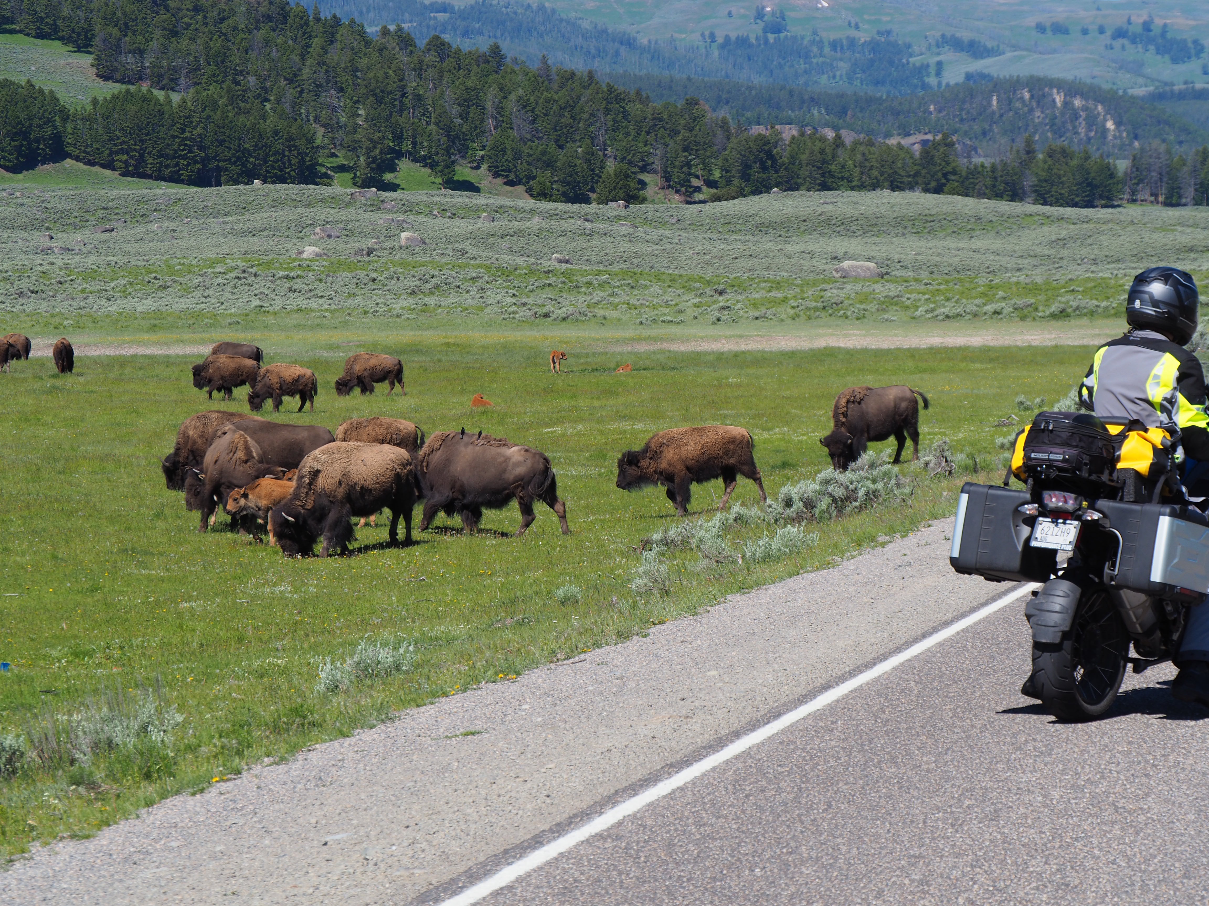 Riding into Yellowstone from the NE entrance allowed us to go through the Lamar Valley. Absolutely worth it because we saw a ton of buffalo, far and near- like crossing the road.