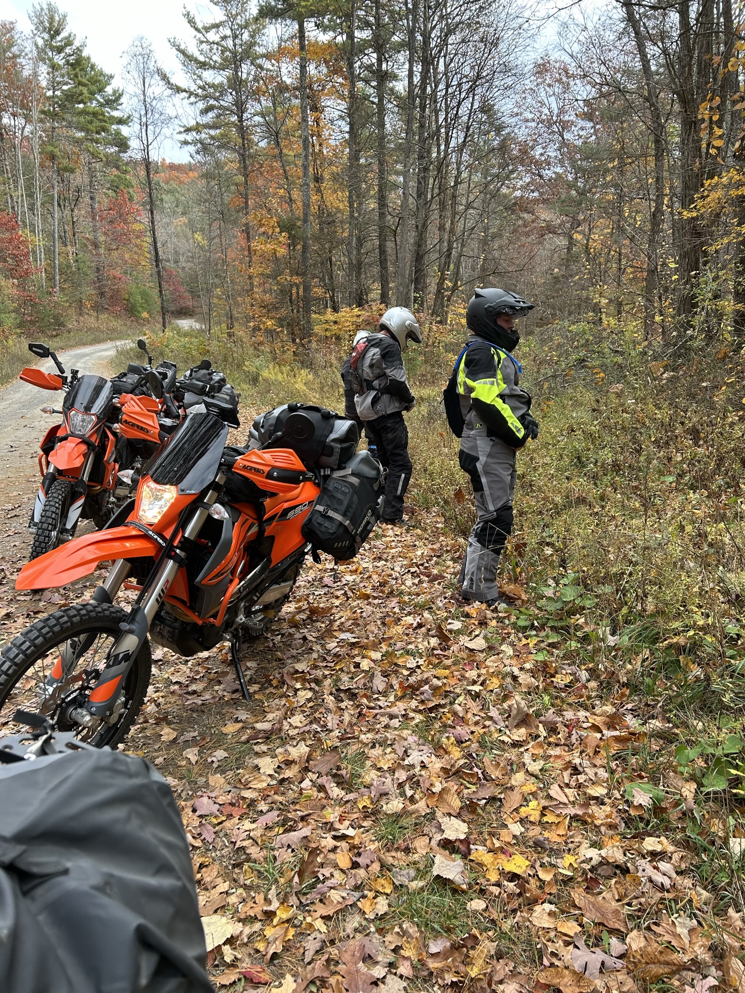 Dropping off the knob, we slid down Flagpole Rd and Dunkle Hollow Rd to US 33. Dunkle Hollow was the toughest portion of the entire trip – a downhill dirt jeep trail with large, slick rocks hidden by leaves, while meeting vehicles that wanted to take their half down the middle. I was the only one with a get-off (well two, at zero mph less than a foot apart). While Terry and Brian thoroughly enjoyed this “road”, Matt and I were glad when it flattened into a gravel road near Switzer Lake.