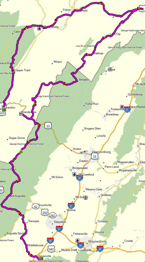 After a lunch break in Brandywine WV, we headed north to Wardensville WV on mostly gravel roads including Westside Rd (MABDR section 3, TAT), Camp Run, Criders Rd, Crab Run, and Squirrel Gap (all TAT). Due to our late departure and my slow pace on Dunkle Hollow, we had to slab it from Wardensville to Moorefield WV on US 48, where we picked up section 3 of the MABDR again, completing our day by running Smoke Hole Rd (what a blast – it’s been repaved since I was last on it in 2016!) south to Franklin.