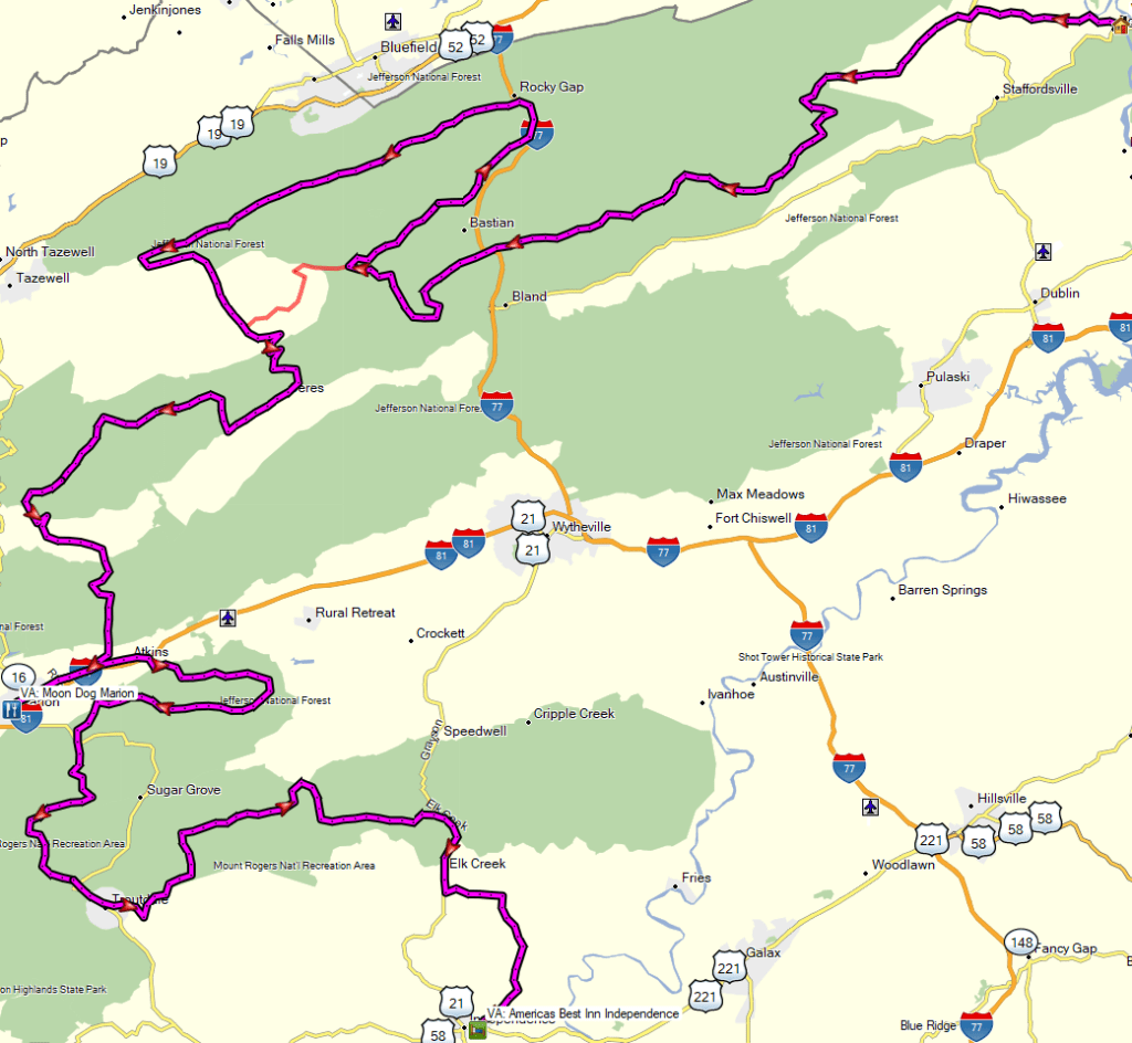 Our morning was spent in the Jefferson National Forest, hitting Dismal Creek Rd, Kimberling Rd, and Wyrick Trail. The BDR then takes Hwy 42 west to Poor Valley Rd, but I found what I thought would be a fun addition – north and west on Burkes Garden Rd / Round Mountain Rd to Burkes Garden, then south on Burkes Garden Rd / Sharon Springs Rd back to Hwy 42.