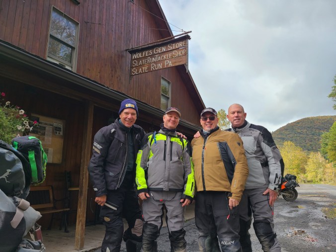 By midday, we were in Slate Run, fueling up at Wolfes General Store. The food was solid, the coffee was hot (I’m told), and nobody asked why we looked like we’d slept in a ditch. A+ stop. From there, the route dipped into Sproul State Forest — and that’s where things got interesting.