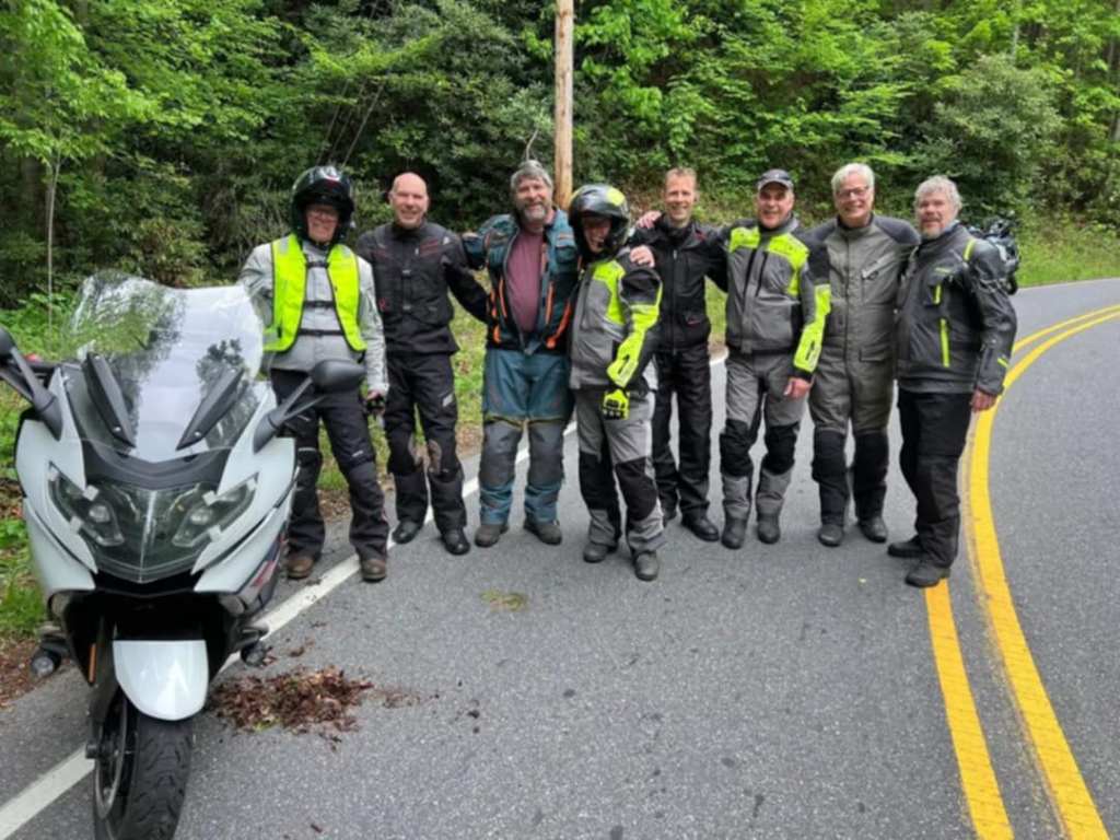 Lunch at The Woodshed came with a dead K1600 (Joey’s). No lights, no power—until magically it restarted. Then it died again. A loose ground terminal was the culprit, discovered after we all melted into our gear from the heat and humidity. By the time we cleared Gatlinburg traffic and hit Foothills Parkway, the rain came back. And stayed. That was our slowest Dragon run ever. To top it off, a car in front of us tried to pull over to let us pass, slid into a muddy ditch, and stopped—partially saved from a full plunge by a well-placed tree. Driver was fine and calling a tow (with magical cell reception none of us could replicate), so we finally returned to the lodge soaked, tired, and maybe slightly wiser.