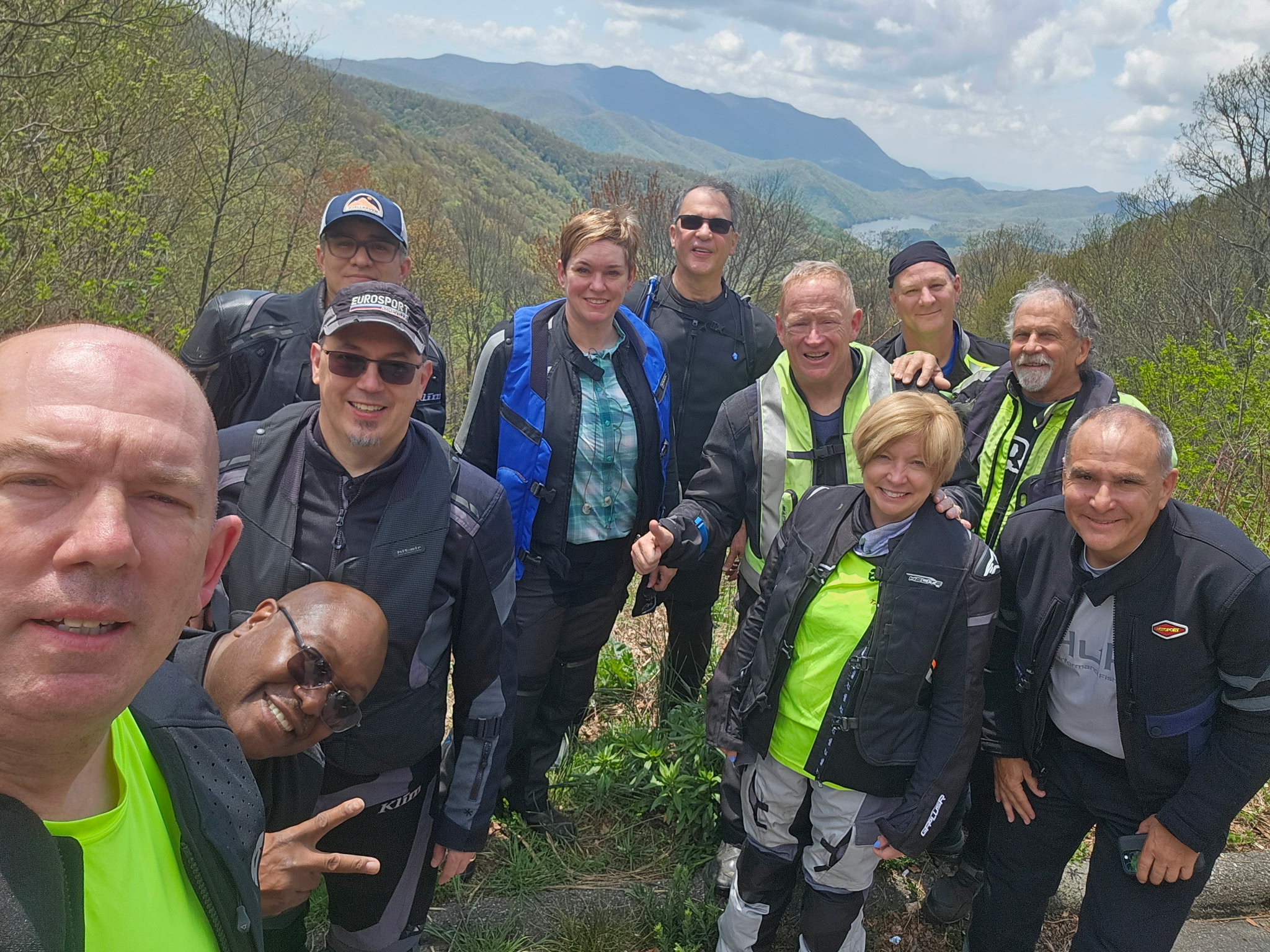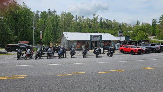 We split into two spirited groups; Terry led one out 30 minutes later than originally scheduled, Stephanie & I followed with nine bikes a few minutes later (“leading” a Spirited group only means that you might be the 1st bike as the group leaves the lodge – after that, whoever feels froggy takes point, so nearly every rider leads sometime during the day). Highlights (if you can call them that) included a wet out-and-back on the Road to Nowhere, a glorious Hwy 209 (The Rattler) under sunshine, and an unexpected gravel shortcut across the Pigeon River thanks to GPS “wizardry”. Three bikes—including Gerrit on an S1000XR—rode through it before we could shout “Nooooo!” via the Cardo/Sena bridge (which had failed again).