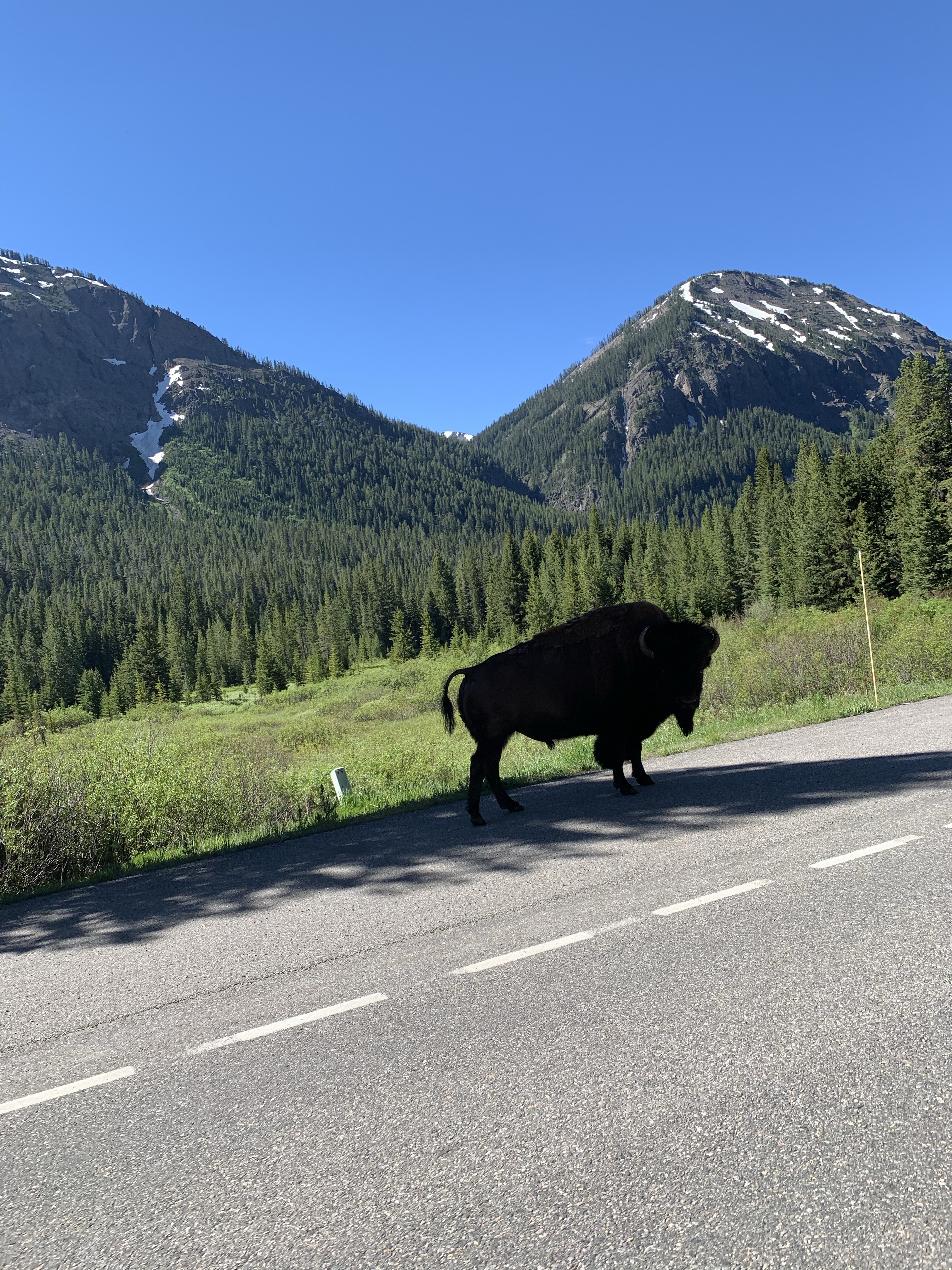 Today, we rode Chief Joseph Highway again to Cooke City , topped off gas (they are still not welcoming of business) and headed into Yellowstone. Just outside of Cooke City was our first buffalo sighting. It was a bit close to the road for my liking, but did not mind that we were there. Thank goodness most our motorcycles sound like vacuum cleaners.